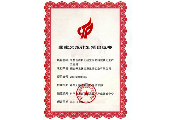國家火炬項(xiàng)目證書